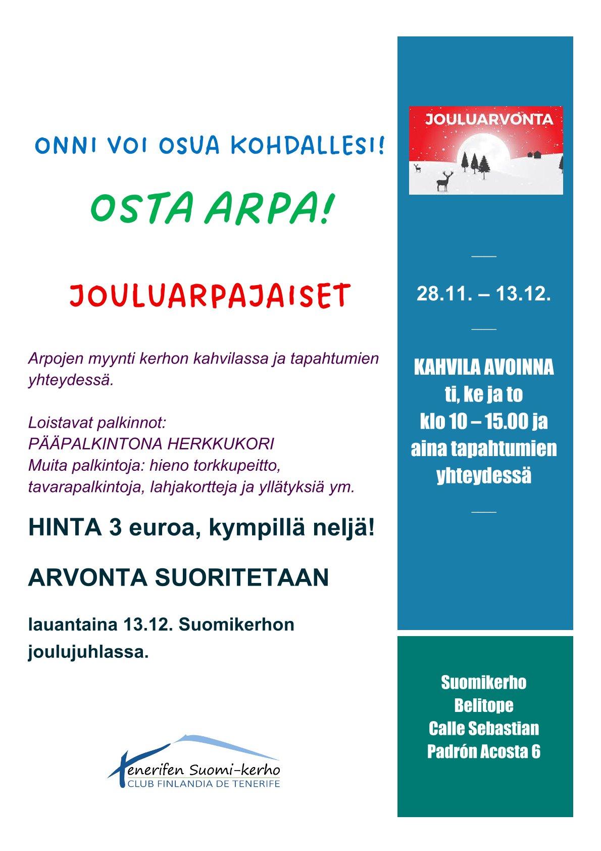 Arvan hinta 3 € ja kympillä neljä arpaa.