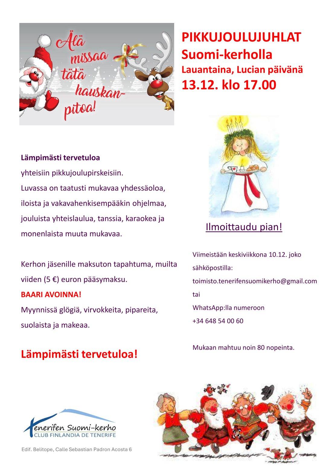 PIKKUJOULUJUHLAT Suomi-kerholla Lauantaina 13.12. klo 17.00 Lämpimästi tervetuloa yhteisiin pikkujoulupirskeisiin. Luvassa on taatusti mukavaa yhdessäoloa, iloista ja vakavahenkisempääkin ohjelmaa,…