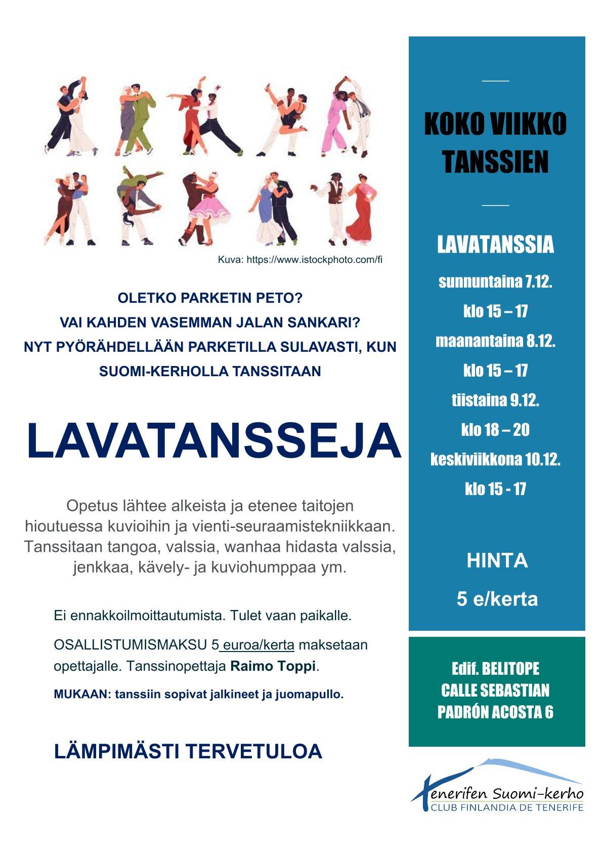 TANSSITAAN LAVATANSSEJA Opetus lähtee alkeista ja etenee taitojen hioutuessa kuvioihin ja vienti-seuraamistekniikkaan. Tanssitaan tangoa, valssia, wanhaa hidasta valssia, jenkkaa, kävely- ja…