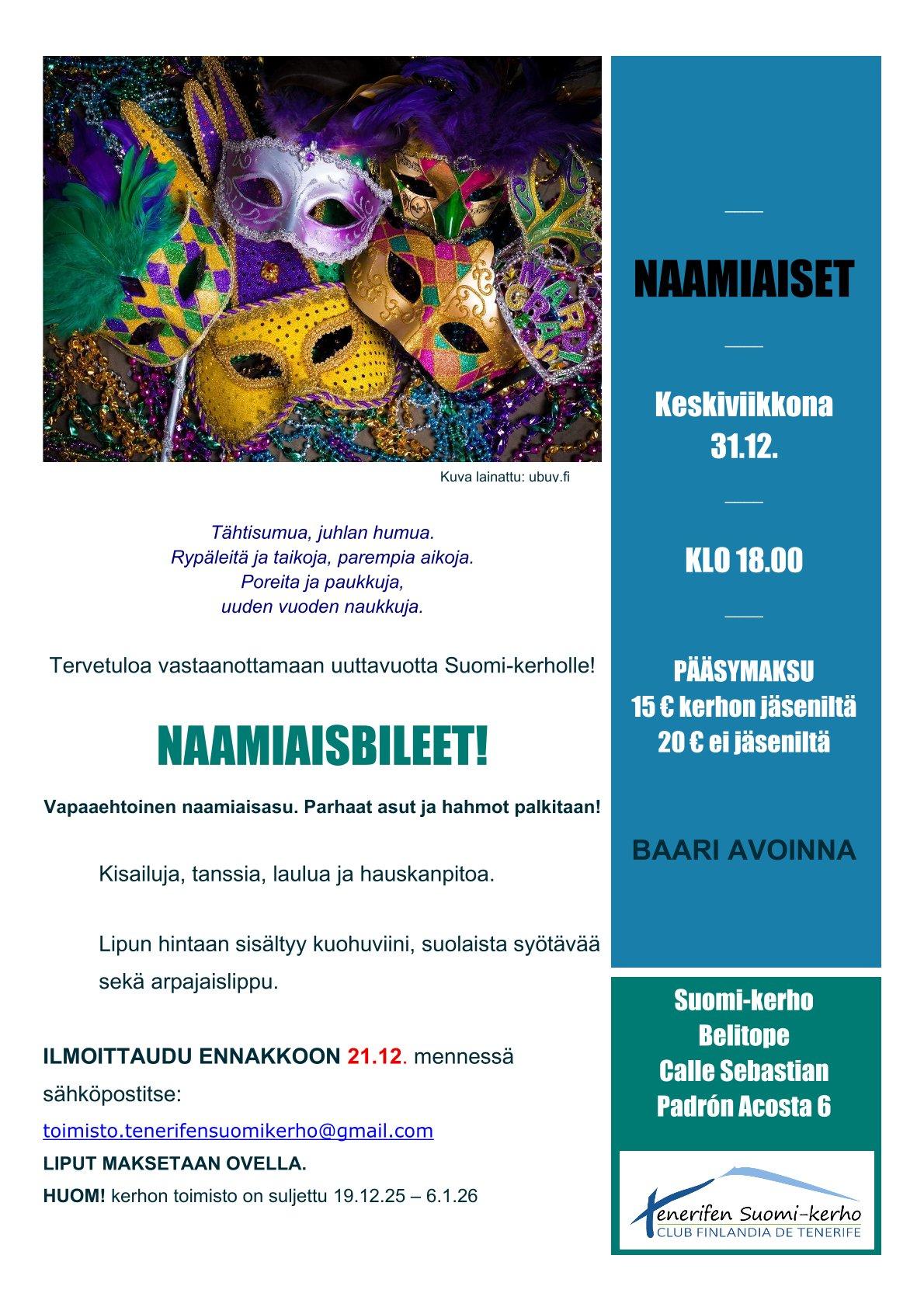 Uudenvuoden vastaanotto Suomi-kerholla 31.12. klo 18.00 NAAMIAISET (naamiaisasu vapaaehtoinen) Tilaisuus on kaikille avoin. Liput jäsenille 15 € ja EI jäsenille 20 € Liput myydään ovelta, mutta…