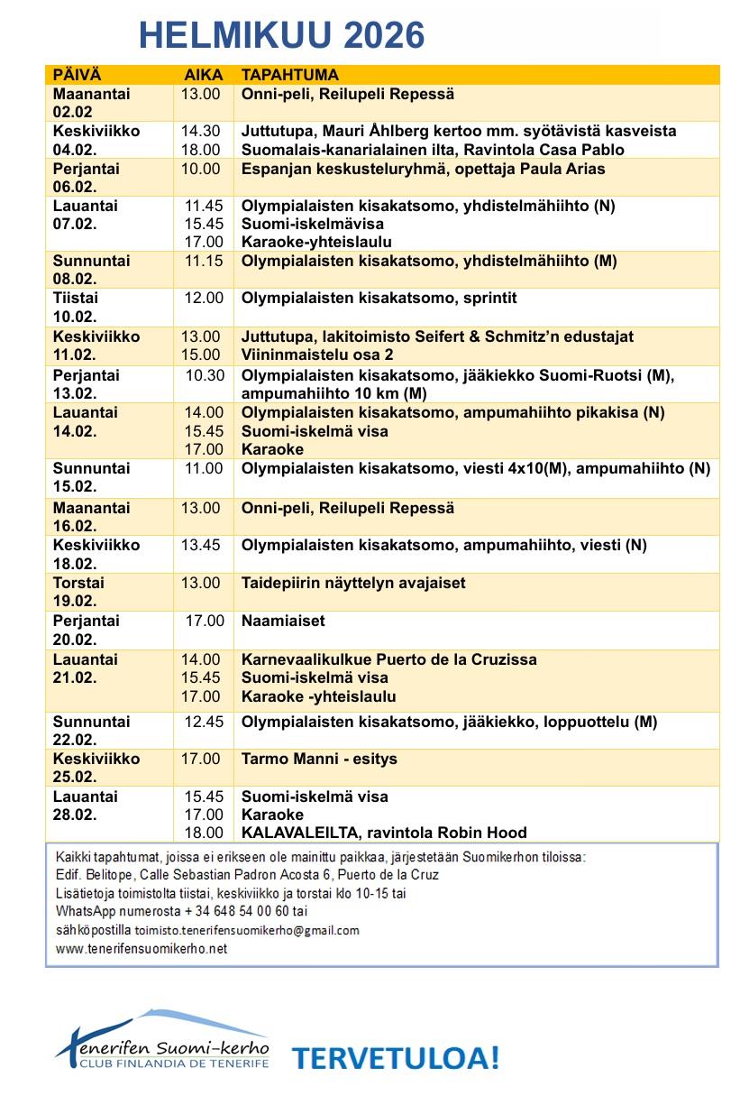 Molemmat tapahtumat ovat täynnä! Suomi-kerhon jäsenille Tervetuloa Suomi-kerholle oppimaan viineistä. Keväällä 2026 on esillä viinejä Espanjan mantereelta sekä Teneriffan saaren paikallisia…