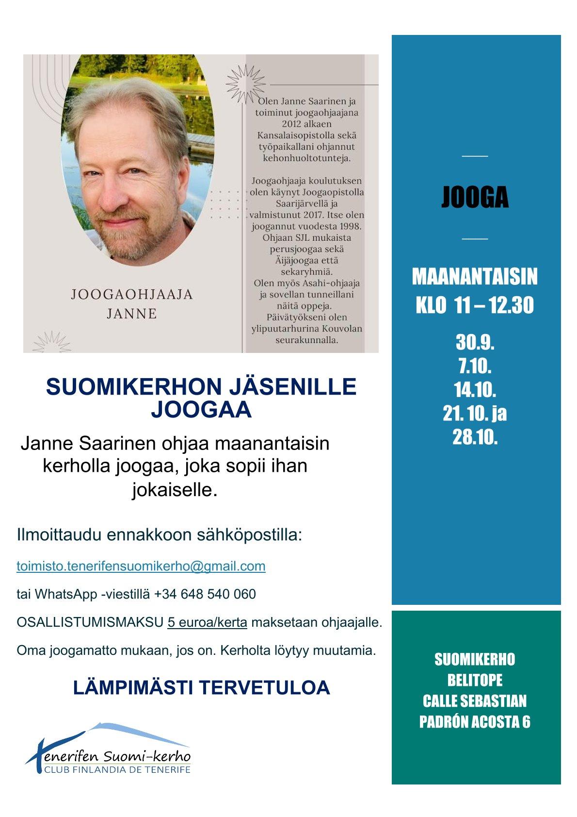Janne Saarinen ohjaa maanantaisin kerholla joogaa, joka sopii ihan jokaiselle. Ilmoittaudu ennakkoon sähköpostilla: toimisto.tenerifensuomikerho@gmail.com tai WhatsApp -viestillä +34 648 540 060 OSALLISTUMISMAKSU 5 euroa/kerta maksetaan ohjaajalle.