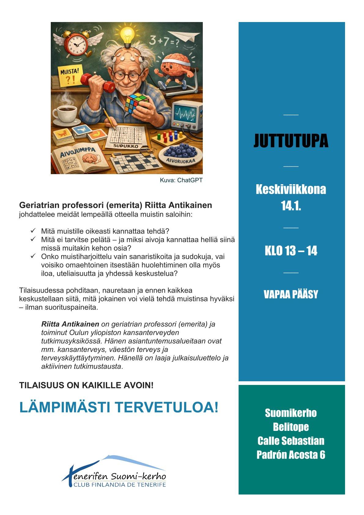 Tilaisuudessa pohditaan, nauretaan ja ennen kaikkea keskustellaan siitä, mitä jokainen voi vielä tehdä muistinsa hyväksi – ilman suorituspaineita.