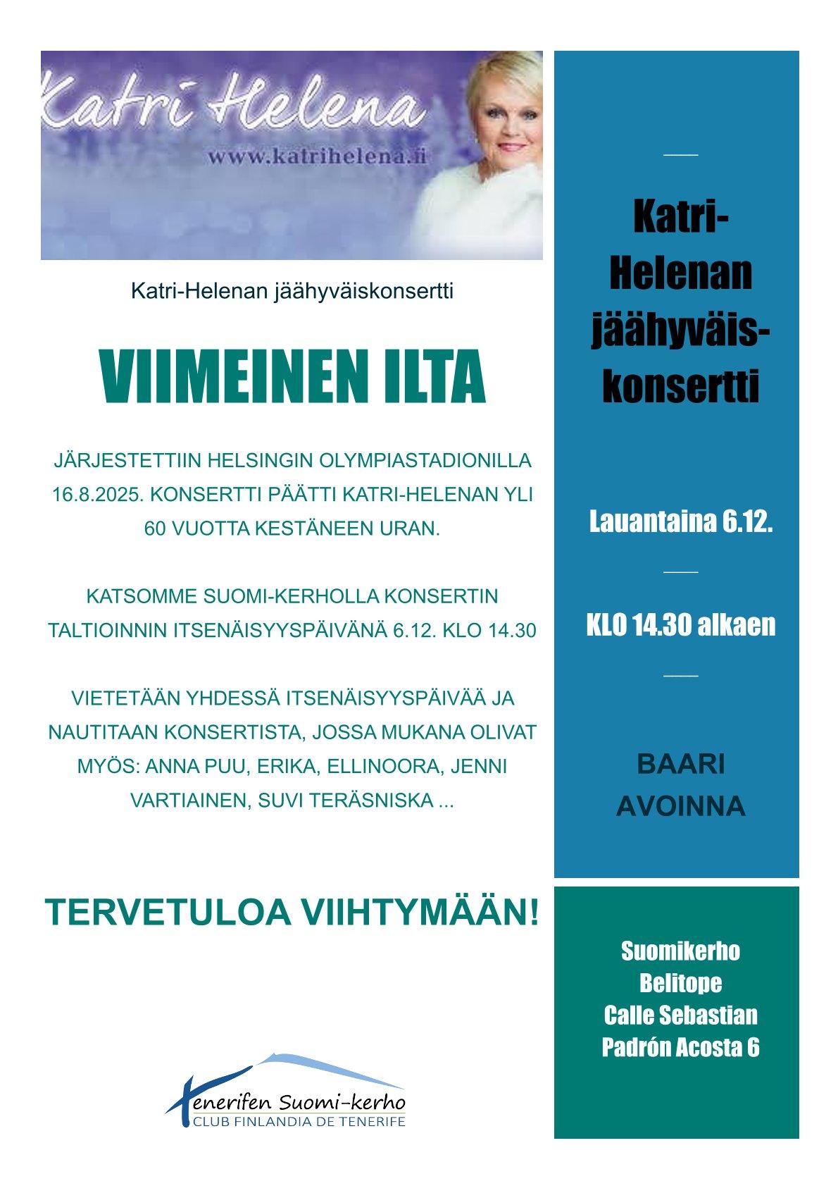KONSERTTI PÄÄTTI KATRI-HELENAN YLI 60 VUOTTA KESTÄNEEN URAN. KATSOMME SUOMI-KERHOLLA KONSERTIN TALTIOINNIN ITSENÄISYYSPÄIVÄNÄ 6.12. KLO 14.30