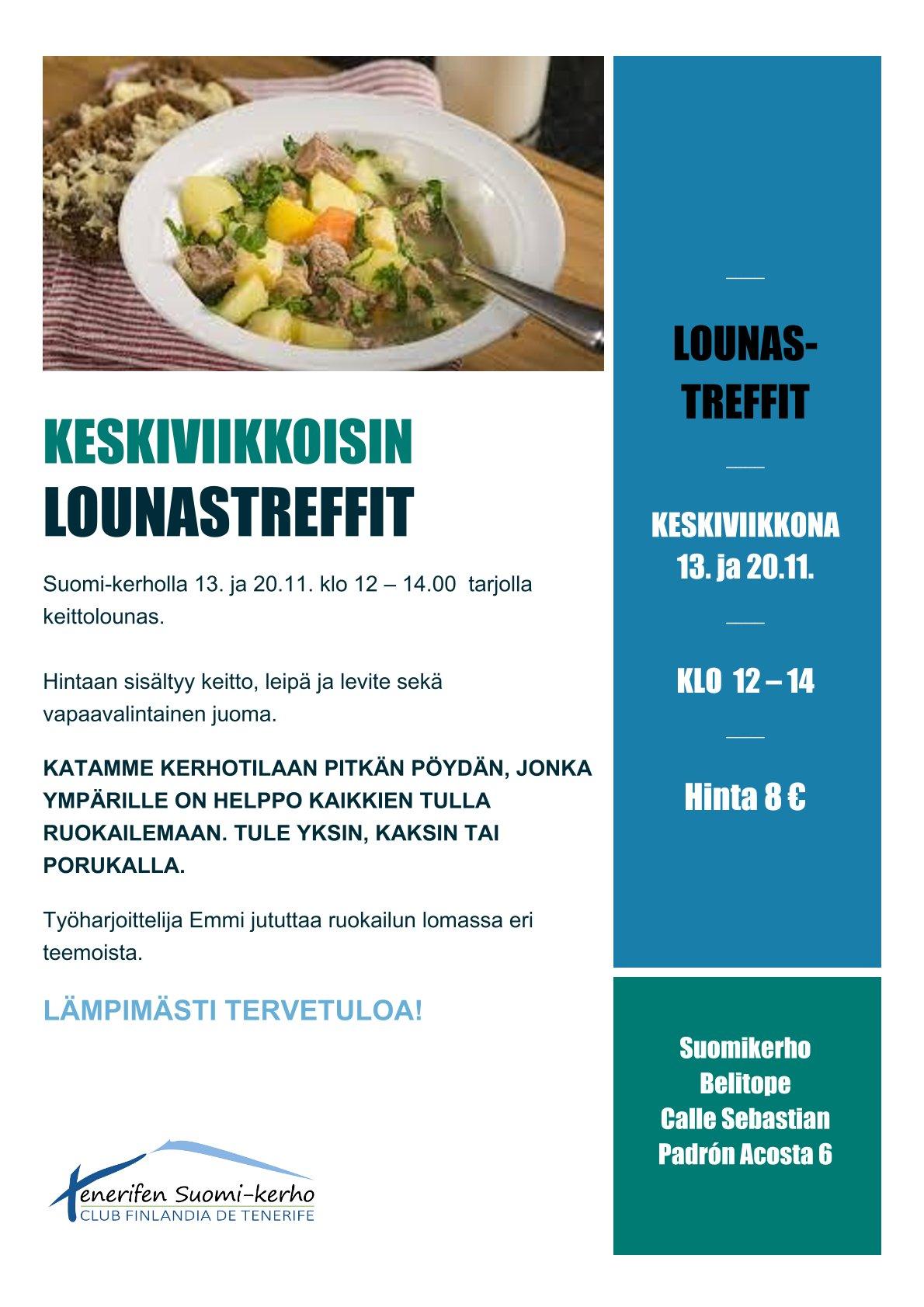 Tervetuloa sopalle Suomi-kerholle keskiviikkona 20.11. klo 12 – 14.00.