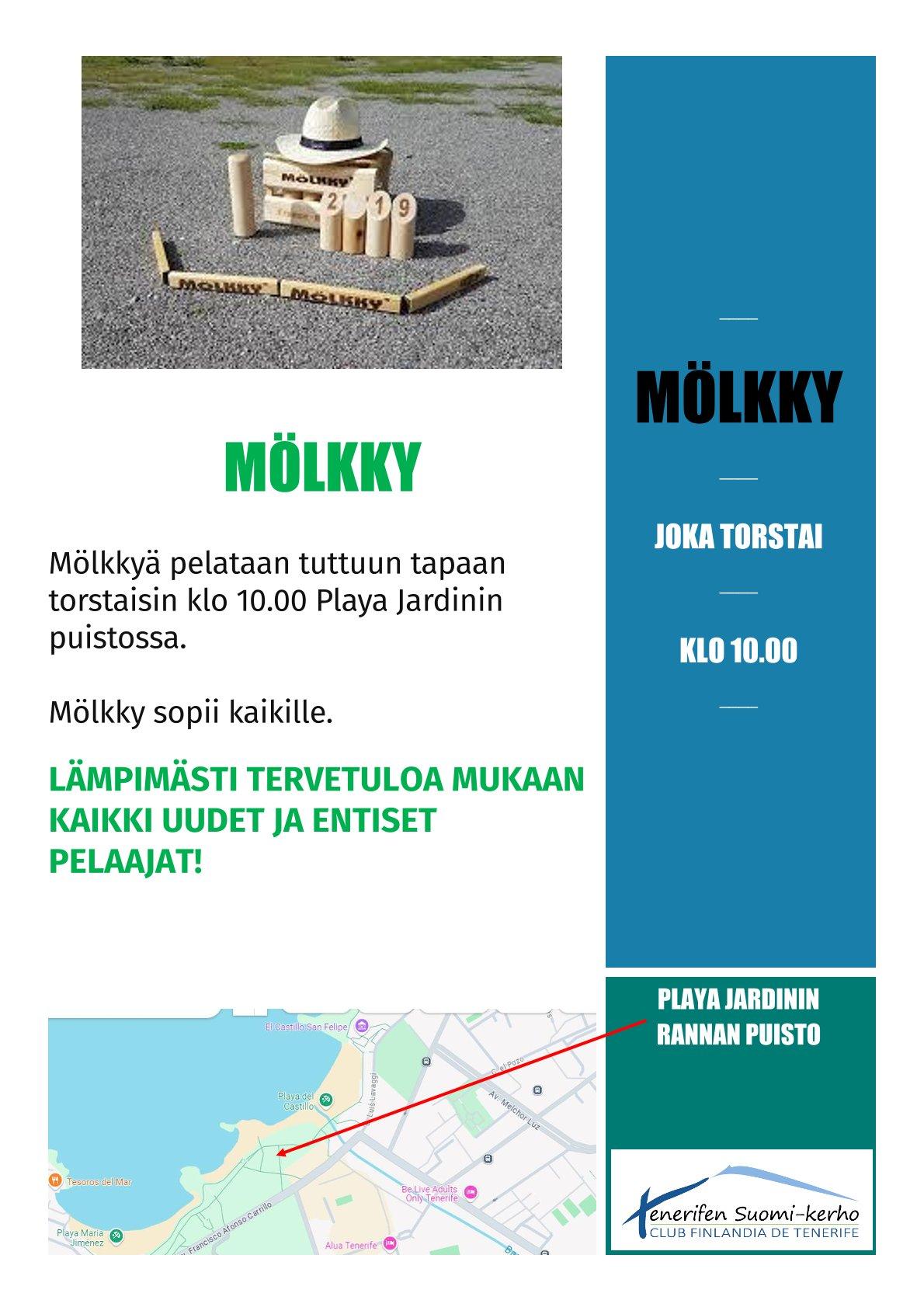 MÖLKKYÄ pelataan jälleen joka torstai Playa Jardinin rannan puistossa klo 10.00. Mölkky on kiva peli ja sitä osaa pelata ihan jokainen.