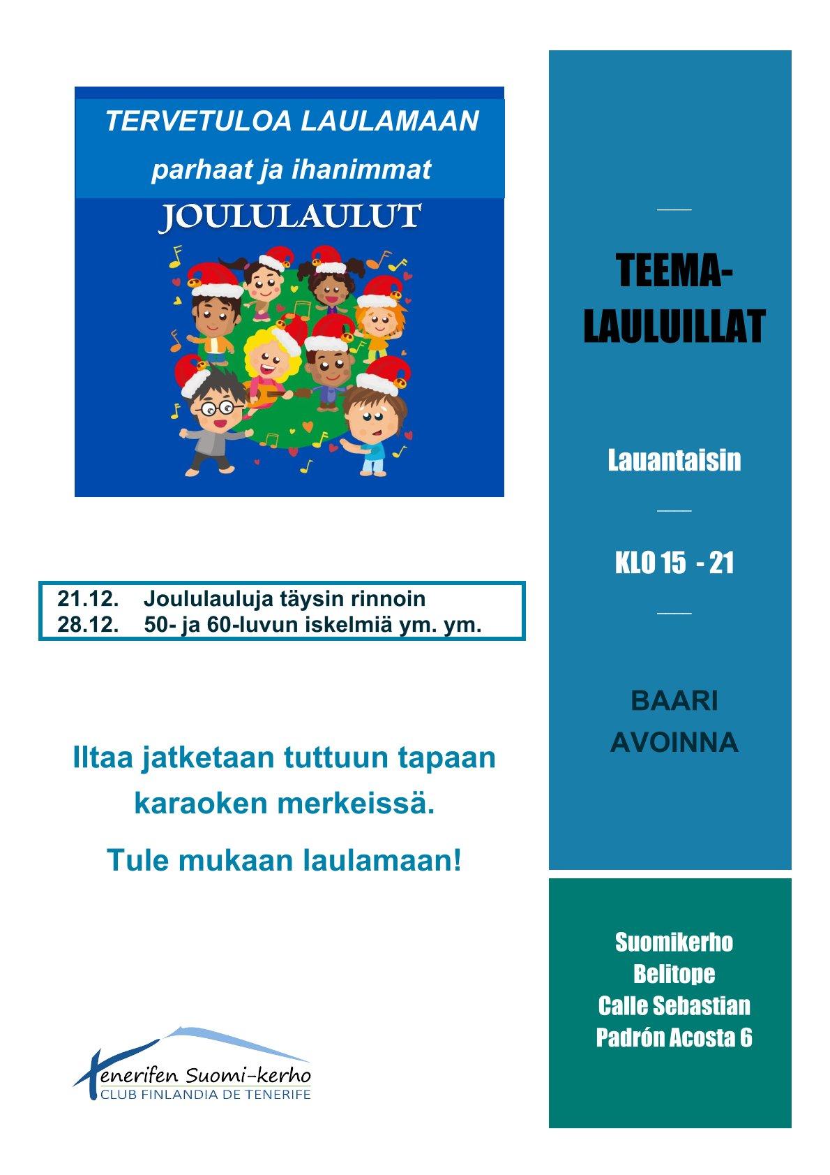 Jouluinen teemalauluilta siirtyi sairaustapauksen vuoksi viikolla. Lauantaina 21.12. klo 15.00 lauletaan täysin rinnoin kauneimmat ja ihanimmat joululaulut.