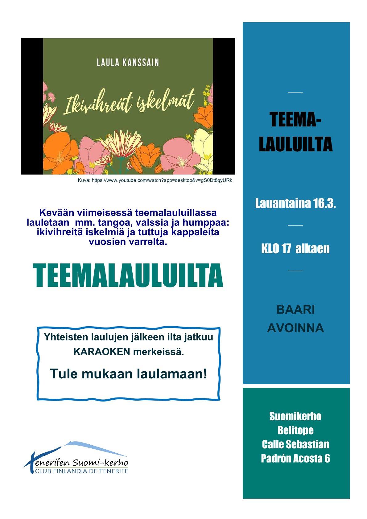 Kevään viimeisessä teemalauluillassa lauletaan mm. tangoa, valssia ja humppaa: ikivihreitä iskelmiä ja tuttuja kappaleita vuosien varrelta.