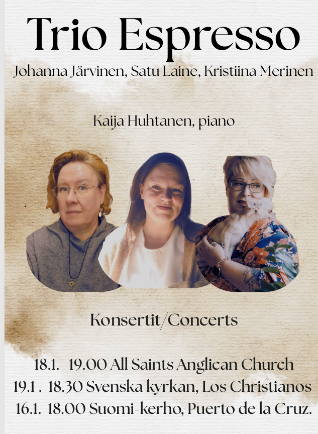 Trio Espresso esittää irlantilaisia ja suomalaisia kansanlauluja. Ohjelmistossa myös Anna-Mari Kähärän kappaleita.