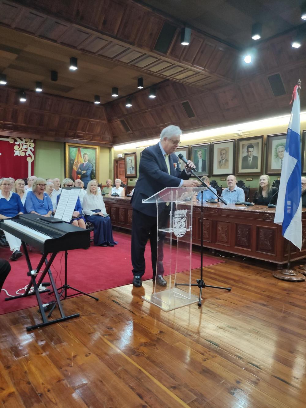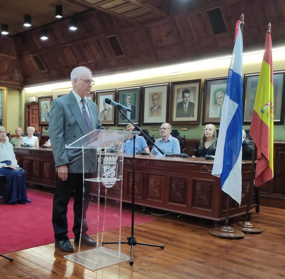 Lyhyt yhteenveto kaupunginjohtajan puheesta: Kaupungin johtaja toivottaa hyvää itsenäisyyspäivää kaikille Puerto de la Cruzissa oleville suomalaisille virtuaalisesti, sillä corona on estänyt pitämään perinteellisen yhteisen juhlan, jossa he ovat päässeet kuuntelemaan musiikkiamme sekä tutustumaan kulttuurimme. Terveiset lähetetään kaikesta huolimatta samalla kiintymyksellä kuin aina.